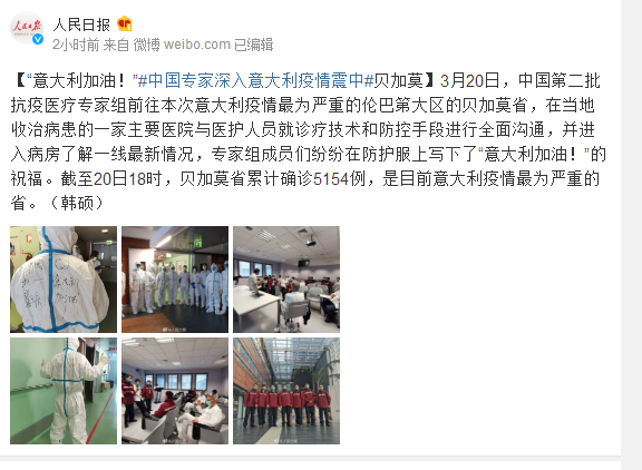 3月20日,中国第二批抗疫医疗专家组前往本次意大利疫情最为严重的伦巴第大区的贝加莫省,在当地收治病患的一家主要医院与医护人员就诊疗技术和防控手段进行全面沟通,并进入病房了解一线最新情况,专家组成员们纷纷在防护服上写下了“意大利加油!”的祝福。截至20日18时,贝加莫省累计确诊5154例,是目前意大利疫情最为严重的省。(韩硕)