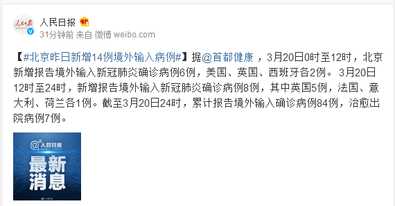 据@首都健康 ,3月20日0时至12时,北京新增报告境外输入新冠肺炎确诊病例6例,美国、英国、西班牙各2例。 3月20日12时至24时,新增报告境外输入新冠肺炎确诊病例8例,其中英国5例,法国、意大利、荷兰各1例。截至3月20日24时,累计报告境外输入确诊病例84例,治愈出院病例7例。
