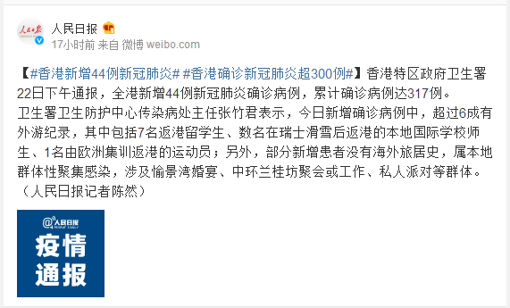香港特区政府卫生署22日下午通报,全港新增44例新冠肺炎确诊病例,累计确诊病例达317例。