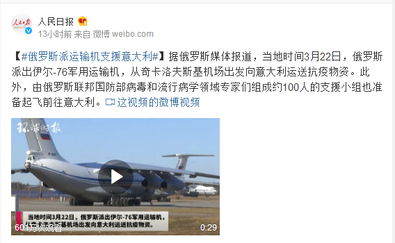 据俄罗斯媒体报道,当地时间3月22日,俄罗斯派出伊尔-76军用运输机,从奇卡洛夫斯基机场出发向意大利运送抗疫物资。此外,由俄罗斯联邦国防部病毒和流行病学领域专家们组成约100人的支援小组也准备起飞前往意大利。