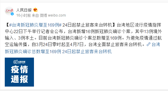 台湾地区流行疫情指挥中心22日下午举行记者会公布,台湾新增16例新冠肺炎确诊个案,其中13例境外输入、3例本土。目前台湾新冠肺炎确诊个案总数增至169例。为避免疫情通过航空运输传播,自3月24日零时起至4月7日,台湾全面禁止旅客来台转机。