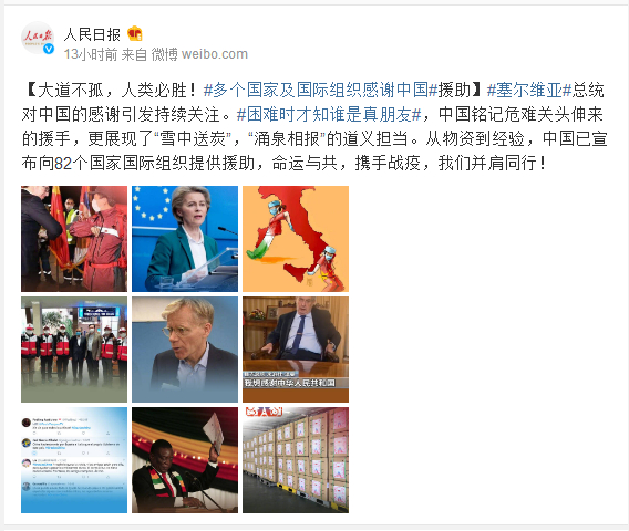 #塞尔维亚#总统对中国的感谢引发持续关注。#困难时才知谁是真朋友#,中国铭记危难关头伸来的援手,更展现了“雪中送炭”,“涌泉相报”的道义担当。从物资到经验,中国已宣布向82个国家国际组织提供援助,命运与共,携手战疫,我们并肩同行!