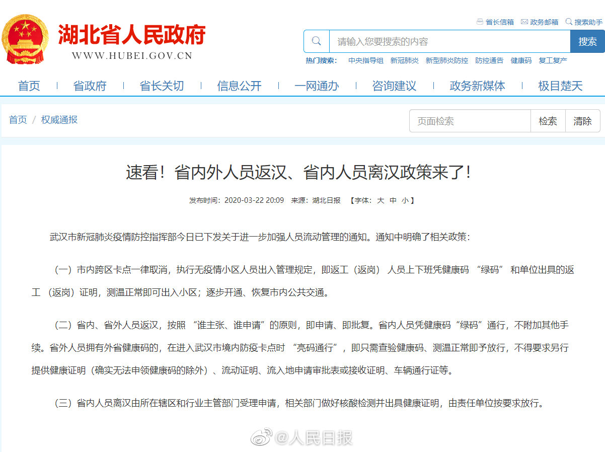 武汉市新冠肺炎疫情防控指挥部今日已下发关于进一步加强人员流动管理的通知。通知中明确了相关政策: