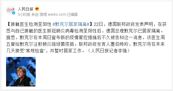 据悉,默克尔在本周日宣布新的疫情管控措施后不久被告知这一消息,该医生周五曾给默克尔注射肺炎链球菌疫苗。联邦政府发言人塞伯特称,默克尔将在未来几天接受“常规检查”,并暂时居家工作。(人民日报记者李强)