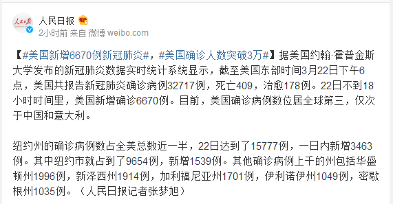 据美国约翰·霍普金斯大学发布的新冠肺炎数据实时统计系统显示,截至美国东部时间3月22日下午6点,美国共报告新冠肺炎确诊病例32717例,死亡409,治愈178例。22日不到18小时时间里,美国新增确诊6670例。目前,美国确诊病例数位居全球第三,仅次于中国和意大利。