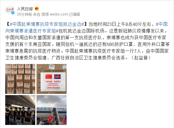 当地时间23日上午8点40分左右,#中国向柬埔寨派遣医疗专家组#包机抵达金边国际机场。这是新冠肺炎疫情爆发以来,中国向周边和东盟国家派遣的第一支抗疫医疗队,柬埔寨也成为获中国医疗专家支援的首个东南亚国家。随同包机一道抵达的还有N95防护口罩、医用外科口罩等柬埔寨急需的抗疫医疗物资。中国赴柬埔寨抗疫医疗专家组一行7人,由中国国家卫生健康委员会组建、广西壮族自治区卫生健康委员会选派。(赵益普)
