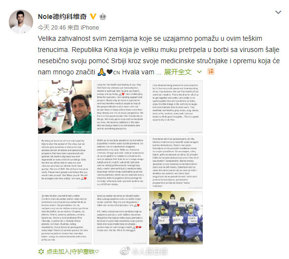 塞尔维亚网球名将@Nole德约科维奇 22日晚发布长文,感谢新冠肺炎疫情期间,中国对塞尔维亚的援助。在微博结尾处,他还用不太标准的拼音打出“谢谢,我爱你中国”几个字,显得格外暖心。