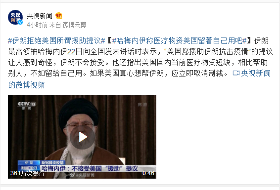 伊朗最高领袖哈梅内伊22日向全国发表讲话时表示,“美国愿援助伊朗抗击疫情”的提议让人感到奇怪,伊朗不会接受。他还指出美国国内当前医疗物资短缺,相比帮助别人,不如留给自己用。如果美国真心想帮伊朗,应立即取消制裁。
