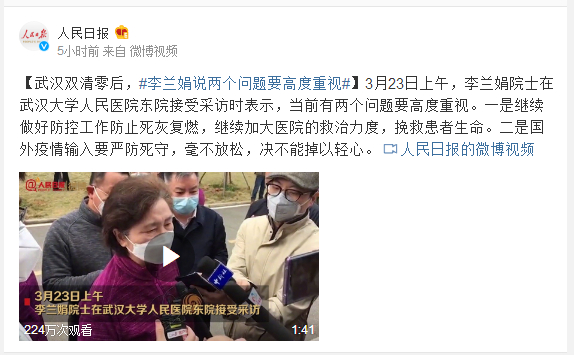 3月23日上午,李兰娟院士在武汉大学人民医院东院接受采访时表示,当前有两个问题要高度重视。一是继续做好防控工作防止死灰复燃,继续加大医院的救治力度,挽救患者生命。二是国外疫情输入要严防死守,毫不放松,决不能掉以轻心。
