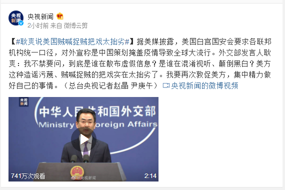 据美媒披露,美国白宫国安会要求各联邦机构统一口径,对外宣称是中国策划掩盖疫情导致全球大流行。外交部发言人耿爽:我不禁要问,到底是谁在散布虚假信息?是谁在混淆视听、颠倒黑白?美方这种造谣污蔑、贼喊捉贼的把戏实在太拙劣了。我要再次敦促美方,集中精力做好自己的事情。(总台央视记者赵晶 尹庚午)