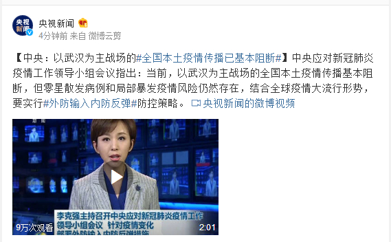 中央应对新冠肺炎疫情工作领导小组会议指出:当前,以武汉为主战场的全国本土疫情传播基本阻断,但零星散发病例和局部暴发疫情风险仍然存在,结合全球疫情大流行形势,要实行#外防输入内防反弹#防控策略。