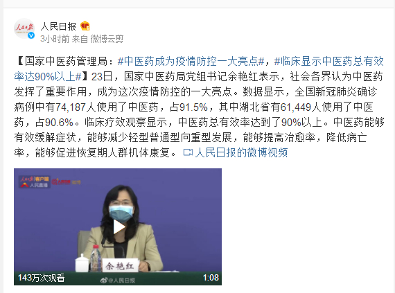 23日,国家中医药局党组书记余艳红表示,社会各界认为中医药发挥了重要作用,成为这次疫情防控的一大亮点。数据显示,全国新冠肺炎确诊病例中有74,187人使用了中医药,占91.5%,其中湖北省有61,449人使用了中医药,占90.6%。临床疗效观察显示,中医药总有效率达到了90%以上。中医药能够有效缓解症状,能够减少轻型普通型向重型发展,能够提高治愈率,降低病亡率,能够促进恢复期人群机体康复。