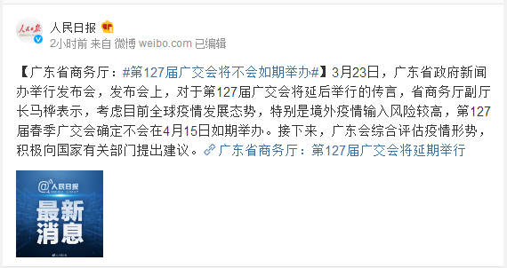 3月23日,广东省政府新闻办举行发布会,发布会上,对于第127届广交会将延后举行的传言,省商务厅副厅长马桦表示,考虑目前全球疫情发展态势,特别是境外疫情输入风险较高,第127届春季广交会确定不会在4月15日如期举办。接下来,广东会综合评估疫情形势,积极向国家有关部门提出建议。