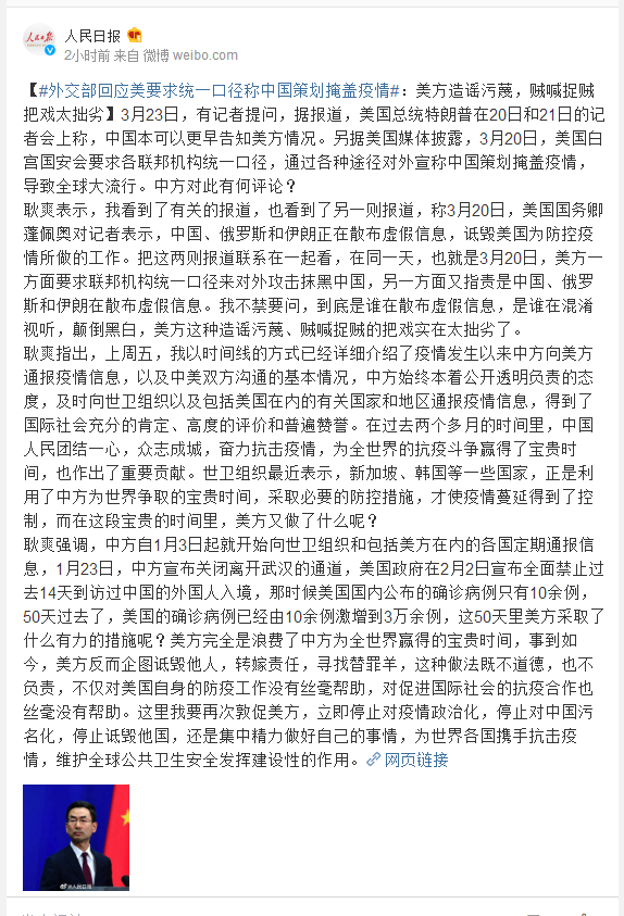 3月23日,有记者提问,据报道,美国总统特朗普在20日和21日的记者会上称,中国本可以更早告知美方情况。另据美国媒体披露,3月20日,美国白宫国安会要求各联邦机构统一口径,通过各种途径对外宣称中国策划掩盖疫情,导致全球大流行。中方对此有何评论?
