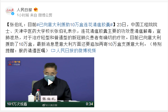 23日,中国工程院院士、天津中医药大学校长张伯礼表示,连花清瘟胶囊主要的功效是清瘟解毒,宣肺泄热,对于治疗轻型和普通型的新冠肺炎患者有确切的疗效。目前已向意大利援助了10万盒,最新消息是意大利方面还要追加再寄10万盒支援意大利。(特别提醒:服药请遵医嘱)
