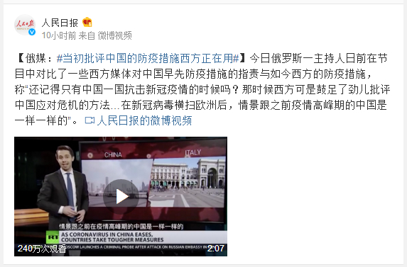 今日俄罗斯一主持人日前在节目中对比了一些西方媒体对中国早先防疫措施的指责与如今西方的防疫措施,称“还记得只有中国一国抗击新冠疫情的时候吗?那时候西方可是鼓足了劲儿批评中国应对危机的方法…在新冠病毒横扫欧洲后,情景跟之前疫情高峰期的中国是一样一样的”。