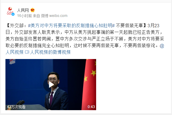 3月23日,外交部发言人耿爽表示,中方从美方挑起事端的第一天起就已经正告美方,美方自始至终置若罔闻,置中方多次交涉与严正立场于不顾,美方对中方将要采取必要的反制措施完全心知肚明,这时候不要再假装无辜,不要再假装惊诧。