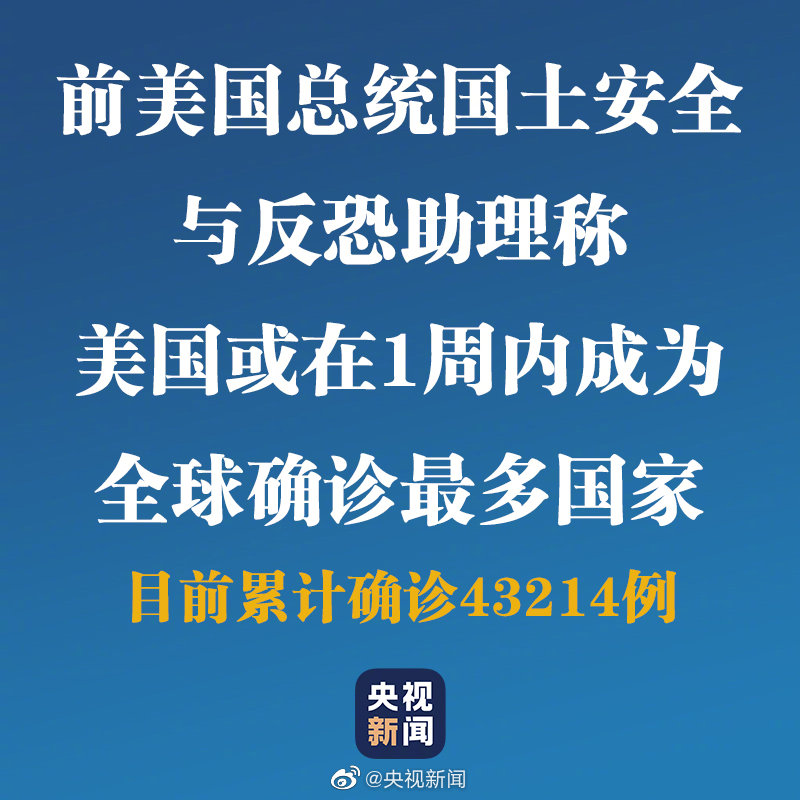 当地时间23日,前美国总统国土安全与反恐助理托马斯·博塞特警告说,美国可能会在一周内成为世界上新冠肺炎确诊病例最多的国家,社会干预势在必行!据美国约翰斯·霍普金斯大学发布的最新数据,截至美东时间23日18时16分,#美国新冠肺炎确诊病例43214例#,死亡病例533例。(央视记者许弢 王逢治)