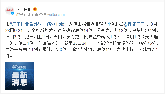 据@健康广东 ,3月23日0-24时,全省新增境外输入确诊病例14例,分别为广州12例(巴基斯坦4例、英国3例、尼日利亚2例,美国、安哥拉、刚果金各输入1例)、深圳1例(美国输入)、佛山1例(美国输入)。截至23日24时,全省累计报告境外输入病例76例,境外关联病例1例;累计出院3例。新增省外输入病例1例,为佛山报告湖北输入1例。