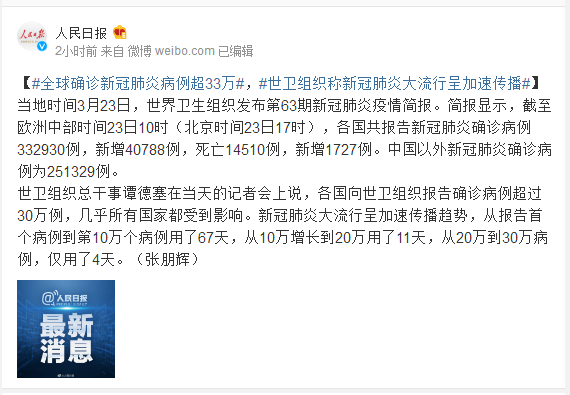 当地时间3月23日,世界卫生组织发布第63期新冠肺炎疫情简报。简报显示,截至欧洲中部时间23日10时(北京时间23日17时),各国共报告新冠肺炎确诊病例332930例,新增40788例,死亡14510例,新增1727例。中国以外新冠肺炎确诊病例为251329例。