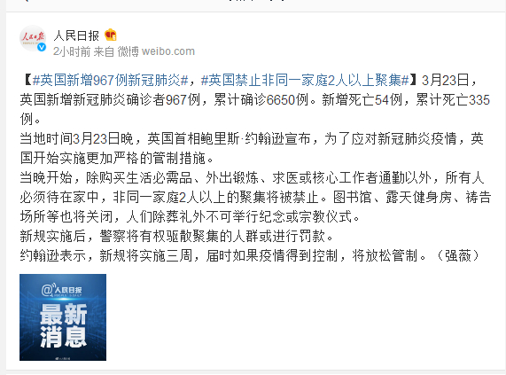 当地时间3月23日晚,英国首相鲍里斯·约翰逊宣布,为了应对新冠肺炎疫情,英国开始实施更加严格的管制措施。