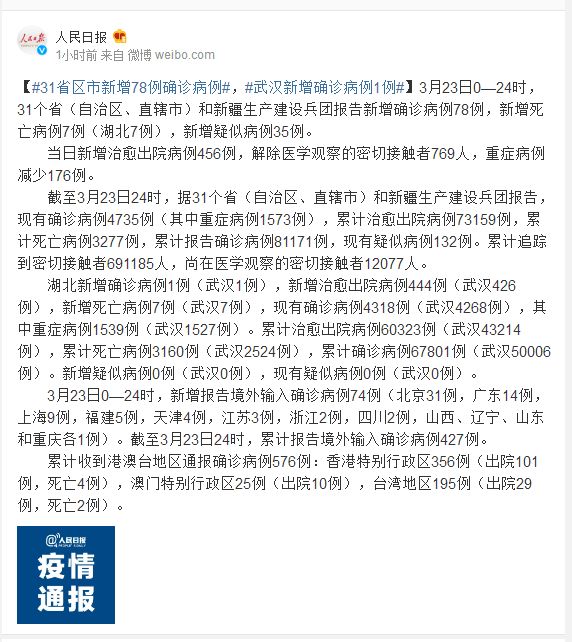 3月23日0—24时,31个省(自治区、直辖市)和新疆生产建设兵团报告新增确诊病例78例,新增死亡病例7例(湖北7例),新增疑似病例35例。