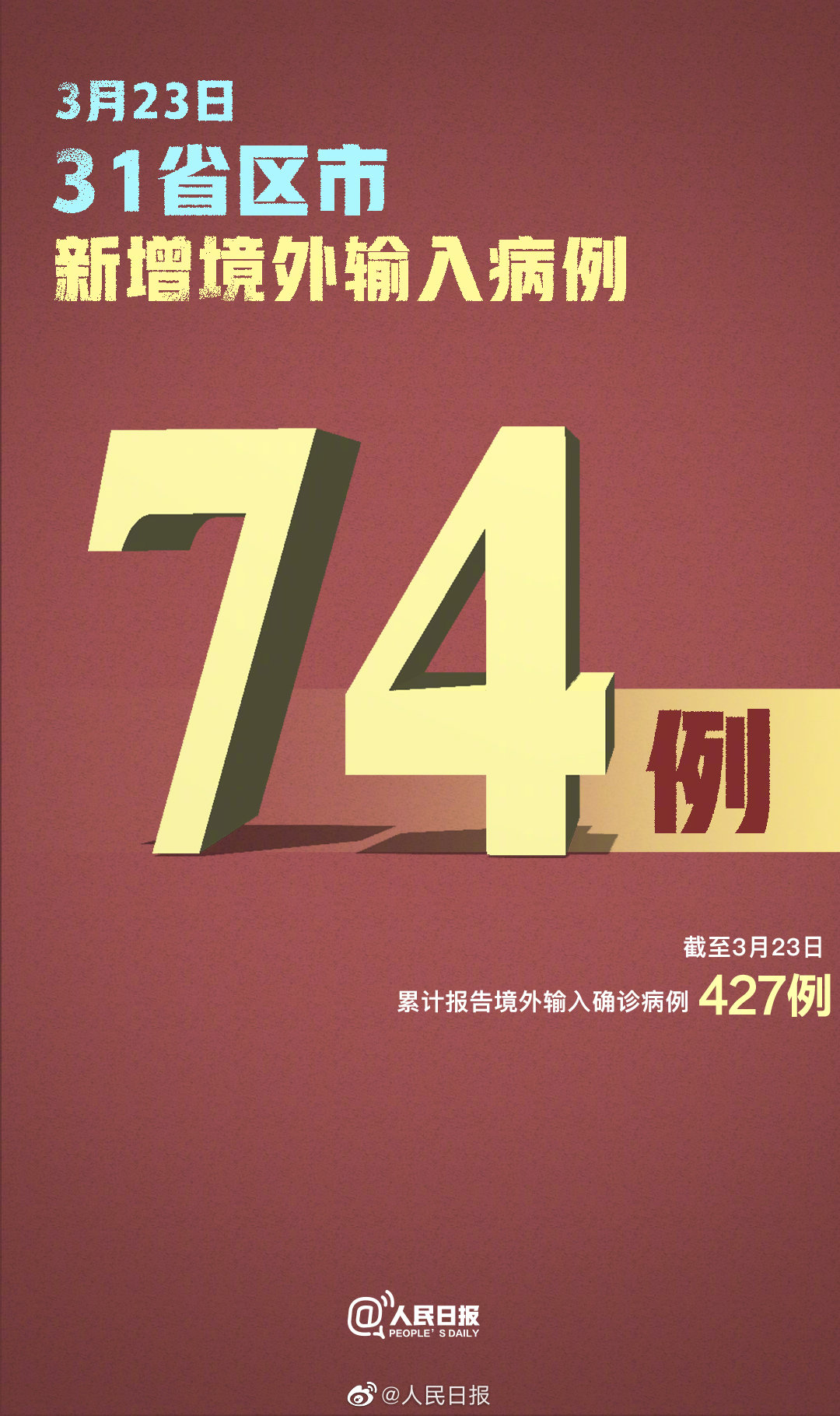 3月23日0—24时,新增报告境外输入确诊病例74例(北京31例,广东14例,上海9例,福建5例,天津4例,江苏3例,浙江2例,四川2例,山西、辽宁、山东和重庆各1例)。截至3月23日24时,累计报告境外输入确诊病例427例。