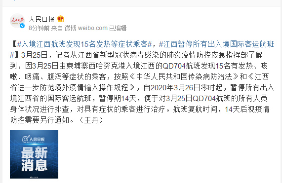 3月25日,记者从江西省新型冠状病毒感染的肺炎疫情防控应急指挥部了解到,因3月25日由柬埔寨西哈努克港入境江西的QD704航班发现15名有发热、咳嗽、咽痛、腹泻等症状的乘客,按照《中华人民共和国传染病防治法》和《江西省进一步防范境外疫情输入操作规程》,自2020年3月26日零时起,暂停所有出入境江西省的国际客运航班,暂停期14天,便于对3月25日QD704航班的所有人员身体状况进行排查,对具有症状的乘客进行治疗。航班复航时间,14天后视疫情防控需要另行通知。(王丹)