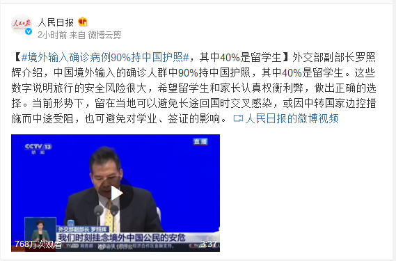 外交部副部长罗照辉介绍,中国境外输入的确诊人群中90%持中国护照,其中40%是留学生。这些数字说明旅行的安全风险很大,希望留学生和家长认真权衡利弊,做出正确的选择。当前形势下,留在当地可以避免长途回国时交叉感染,或因中转国家边控措施而中途受阻,也可避免对学业、签证的影响。