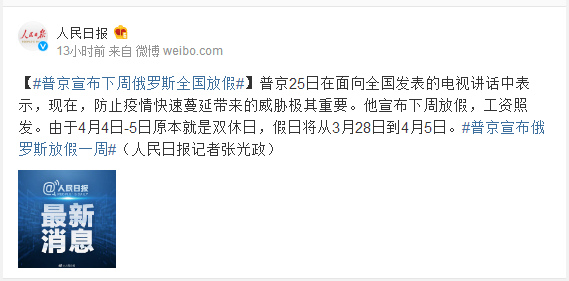 普京25日在面向全国发表的电视讲话中表示,现在,防止疫情快速蔓延带来的威胁极其重要。他宣布下周放假,工资照发。由于4月4日-5日原本就是双休日,假日将从3月28日到4月5日。#普京宣布俄罗斯放假一周#(人民日报记者张光政)
