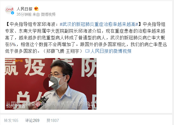 中央指导组专家、东南大学附属中大医院副院长邱海波介绍,现在重症患者的治愈率越来越高了,越来越多的危重型病人转成了普通型的病人,武汉的新冠肺炎病亡率大概在5%,相信这个数据不会再增加了。跟国外的很多国家相比,我们的病亡率是远低于很多国家的。(郑薛飞腾 王翔宇)