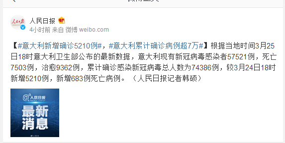 根据当地时间3月25日18时意大利卫生部公布的最新数据,意大利现有新冠病毒感染者57521例,死亡7503例,治愈9362例,累计确诊感染新冠病毒总人数为74386例,较3月24日18时新增5210例,新增683例死亡病例。 (人民日报记者韩硕)