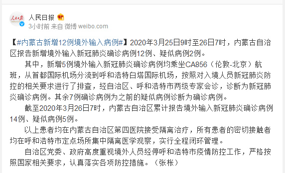 2020年3月25日9时至26日7时,内蒙古自治区报告新增境外输入新冠肺炎确诊病例12例、疑似病例2例。