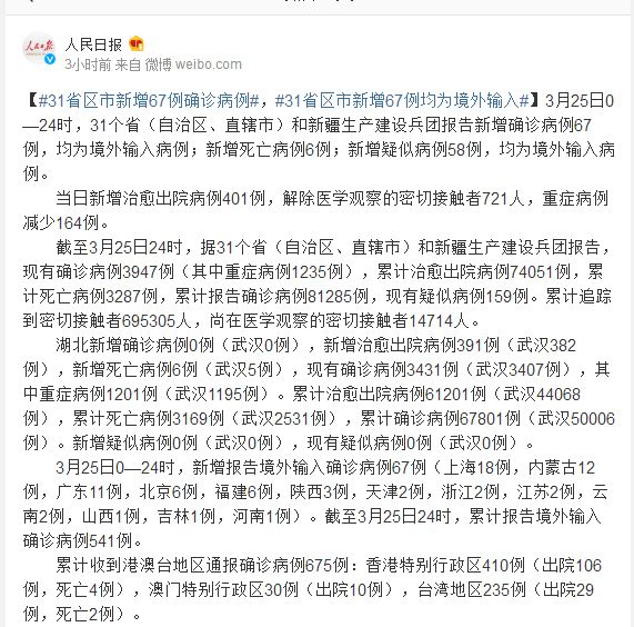 3月25日0—24时,31个省(自治区、直辖市)和新疆生产建设兵团报告新增确诊病例67例,均为境外输入病例;新增死亡病例6例;新增疑似病例58例,均为境外输入病例。