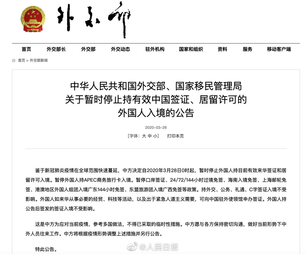 中方决定自2020年3月28日0时起,暂时停止外国人持目前有效来华签证和居留许可入境。暂停外国人持APEC商务旅行卡入境。暂停口岸签证、24/72/144小时过境免签、海南入境免签、上海邮轮免签、港澳地区外国人组团入境广东144小时免签、东盟旅游团入境广西免签等政策。持外交、公务、礼遇、C字签证入境不受影响。外国人如来华从事必要的经贸、科技等活动,以及出于紧急人道主义需要,可向中国驻外使领馆申办签证。外国人持公告后签发的签证入境不受影响。