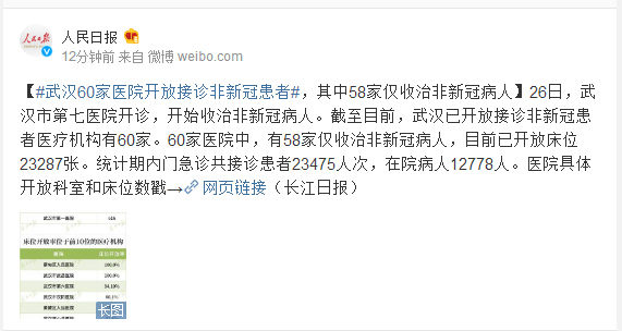 26日,武汉市第七医院开诊,开始收治非新冠病人。截至目前,武汉已开放接诊非新冠患者医疗机构有60家。60家医院中,有58家仅收治非新冠病人,目前已开放床位23287张。统计期内门急诊共接诊患者23475人次,在院病人12778人。
