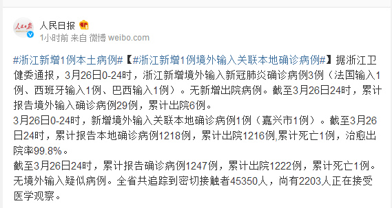 3月26日0-24时,新增境外输入关联本地确诊病例1例(嘉兴市1例)。截至3月26日24时,累计报告本地确诊病例1218例,累计出院1216例,累计死亡1例,治愈出院率99.8%。