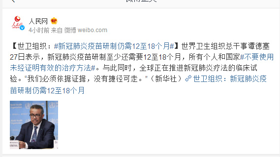 世界卫生组织总干事谭德塞27日表示,新冠肺炎疫苗研制至少还需要12至18个月,所有个人和国家#不要使用未经证明有效的治疗方法#。与此同时,全球正在推进新冠肺炎疗法的临床试验。“我们必须依据证据,没有捷径可走。”(新华社)