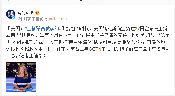据纽约时报,美国福克斯商业频道27日宣布与主播翠西·里根解约。翠西本月在节目中称:民主党将疫情的责任全推给特朗普,“这是再次企图弹劾总统”;民主党和“自由派媒体”试图利用疫情“摧毁”总统。有媒体称,这段评论招致大量批评。此前,翠西因与CGTN主播刘欣辩论而在中国小有名气。(总台记者王逢治)