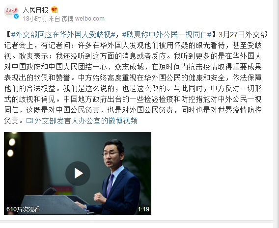3月27日外交部记者会上,有记者问:许多在华外国人发现他们被用怀疑的眼光看待,甚至受歧视。耿爽表示:我还没听到这方面的消息或者反应。我听到更多的是在华外国人对中国政府和中国人民团结一心、众志成城,在短时间内抗击疫情取得重要成果表现出的钦佩和赞誉。中方始终高度重视在华外国公民的健康和安全,依法保障他们的合法权益。我们是这么说的,也是这么做的。与此同时,中方反对一切形式的歧视和偏见。中国地方政府出台的一些检验检疫和防控措施对中外公民一视同仁,这既是对中国公民负责,也是对外国公民负责,同时也是对世界疫情防控负责。