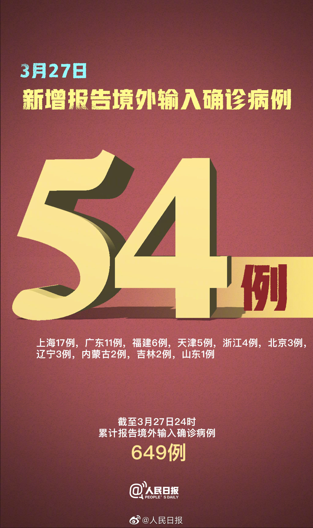 3月27日0—24时,新增报告境外输入确诊病例54例(上海17例,广东11例,福建6例,天津5例,浙江4例,北京3例,辽宁3例,内蒙古2例,吉林2例,山东1例)。截至3月27日24时。