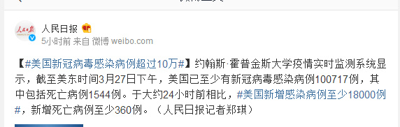 约翰斯·霍普金斯大学疫情实时监测系统显示,截至美东时间3月27日下午,美国已至少有新冠病毒感染病例100717例,其中包括死亡病例1544例。于大约24小时前相比,#美国新增感染病例至少18000例#,新增死亡病例至少360例。(人民日报记者郑琪)