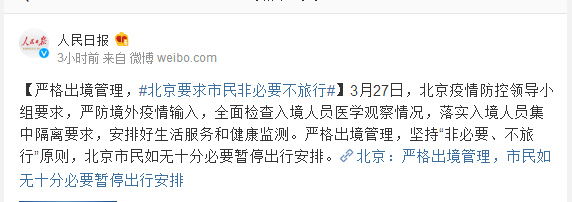 3月27日,北京疫情防控领导小组要求,严防境外疫情输入,全面检查入境人员医学观察情况,落实入境人员集中隔离要求,安排好生活服务和健康监测。严格出境管理,坚持“非必要、不旅行”原则,北京市民如无十分必要暂停出行安排。