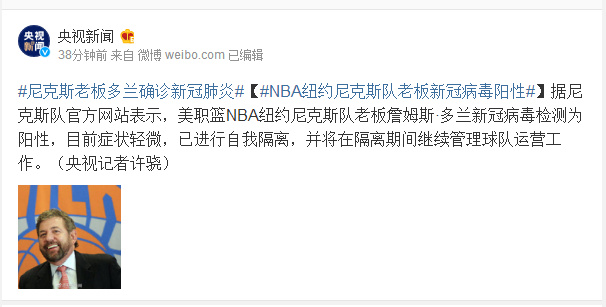 尼克斯老板多兰确诊新冠肺炎:NBA纽约尼克斯队老板新冠病毒阳性