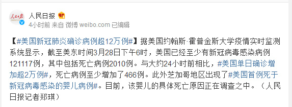 据美国约翰斯·霍普金斯大学疫情实时监测系统显示,截至美东时间3月28日下午6时,美国已经至少有新冠病毒感染病例121117例,其中包括死亡病例2010例。与大约24小时前相比,#美国单日确诊增加超2万例#,死亡病例至少增加了466例。此外芝加哥地区出现了#美国首例死于新冠病毒感染的婴儿病例#。目前,该婴儿的具体死亡原因正在调查之中。(人民日报记者郑琪)