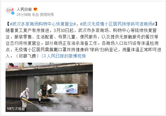 随着复工复产有序推进,3月30日起,武汉市多家商场、购物中心等陆续恢复营业,服装零售、生活配套、母婴儿童、便民服务,以及提供无接触服务的餐饮等业态均将恢复营业。部分商场正在消杀准备工作。各商场入口处均设有体温检测点,无疫情小区居民需佩戴口罩并持健康码“绿码”扫码登记,测量体温正常即可进入。(郑薛飞腾)