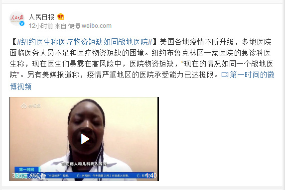 美国各地疫情不断升级,多地医院面临医务人员不足和医疗物资短缺的困境。纽约布鲁克林区一家医院的急诊科医生称,现在医生们暴露在高风险中,医院物资短缺,“现在的情况如同一个战地医院”。另有美媒报道称,疫情严重地区的医院承受能力已达极限。