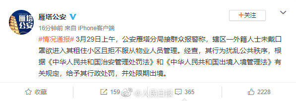 据@雁塔公安 :3月29日上午,公安雁塔分局接群众报警称,辖区一外籍人士未戴口罩欲进入其租住小区且拒不服从物业人员管理。经查,其行为扰乱公共秩序,根据《中华人民共和国治安管理处罚法》和《中华人民共和国出境入境管理法》有关规定,给予其行政处罚,并处限期出境。