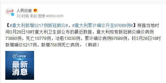 根据当地时间3月29日18时意大利卫生部公布的最近数据,意大利现有新冠肺炎确诊病例73880例,死亡10779例,治愈13030例,累计确诊病例97689例,较3月28日18时新增确诊5217例,新增756例死亡病例。(韩硕)