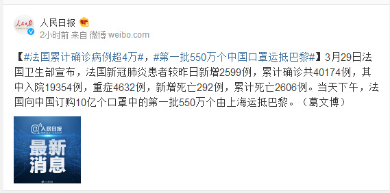 3月29日法国卫生部宣布,法国新冠肺炎患者较昨日新增2599例,累计确诊共40174例,其中入院19354例,重症4632例,新增死亡292例,累计死亡2606例。当天下午,法国向中国订购10亿个口罩中的第一批550万个由上海运抵巴黎。(葛文博)